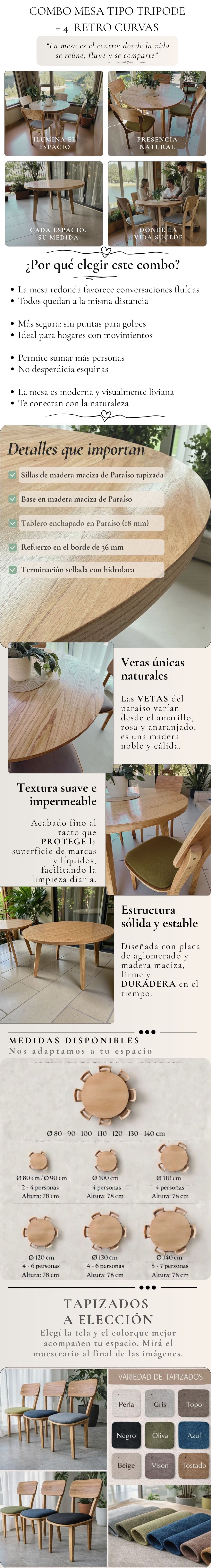 COMBO Mesa redonda patas Trípode con regrueso + 4 sillas Retro Curvas (elegir diámetro)